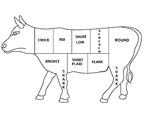 Where’s the Beef?FOOD FOR THOUGHT - August 20, 2003 Mark R. Vogel - Epicure1@optonline.net - Archive See also: Beef, North America’s Favorite Meat; Kobe Beef; etc. also Beef Facts & Trivia; Beef Quotes Comprehending all the different cuts of beef can be a little confusing. For example, did you know that a strip steak, New York strip, Kansas City steak, club steak, shell steak, and top loin steak all come from the same section of beef? Who wouldn’t be confused with such jargon? The diagram below depicts all the cuts found on your typical bovine.