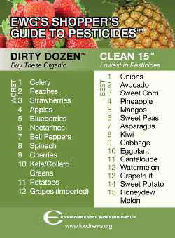 EWG analysts developed the “Clean 15” guide using data from some 89,000 tests for pesticide residues in produce conducted between 2000 and 2008 and collected by the U.S. Department of Agriculture (USDA) and the U.S. Food and Drug Administration (FDA). What’s the difference, you may ask? EWG found that by eating five conventionally-grown fruits and vegetables a day from the Dirty Dozen list, a consumer on average ingests 10 different pesticides; those who stick to the Clean 15 list ingest less than two.