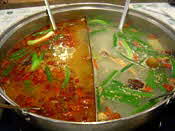 HOT POT!Food for Thought - Mar 24, 2010 - Mark R. Vogel - Epicure1@optonline.net - Mark’s Archive I was introduced to Chinese Hot Pot by my wife who is from Beijing. Hot Pot is now one of my favorite meals. Hot Pot, as the name implies, is a large pot of boiling liquid, often infused with spices, in which all kinds of meats, vegetables, and noodles are cooked. Historically, a ceramic or steel bowl is heated over charcoal and the fluid brought to a boil. The ingredients are then placed in the bowl, cooked, removed, and then topped with a myriad of different sauces, garnishes, and seasonings. For me, Hot Pot epitomizes all the best dimensions of food: it's hearty, intensely flavored, often hot and spicy, and deeply fulfilling. The constituents are extremely diverse and therefore can be tailored to your palate.